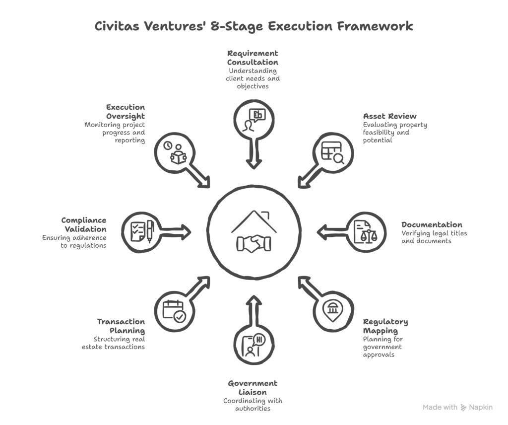 Civitas Ventures delivers real estate & liaison services in Bangalore, Karnataka through a governance-based 8-stage execution framework: